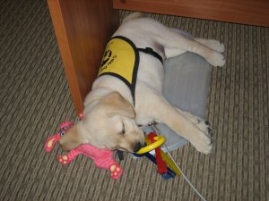 I knew it was going to be a challenge, bringing such a frequent piddler to a place where the door to the outside is, what, seventeen miles away from my desk? The nearest exit-to-pee-spot is a sprint to the door of the office suite, out into the hallway, down the stairs, across the lobby to another set of doors, through another hallway, up a few more stairs and finally, FINALLY outside.