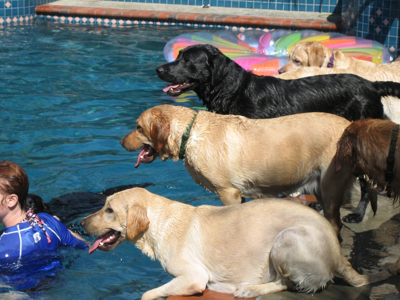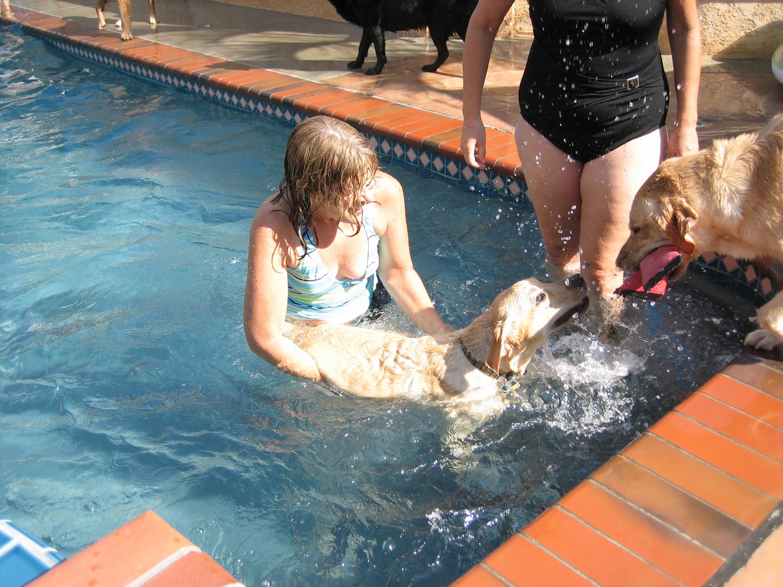 A group of puppy raisers got together for a pool party on Sunday. Perfect day for it here in the middle of our Southern California heat wave, which brought temperatures in the hottest parts of town up to 113 degrees (118 with the heat index). I didn’t officially count the dogs in attendance, but the number could safely be estimated at around a dozen (46 with the enthusiasm index).