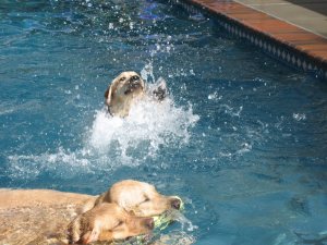 Though he is a brilliant and coordinated dog on dry land, Truman’s seafaring aptitude leaves something to be desired. He eventually got to the point where he would leap enthusiastically into the water (or onto my head if I misjudged the distance) when I stood in the pool and called him, but his swimming skills could use some work. Truman attempted to navigate his aquatic environment by paddling furiously…with his front legs. Was he trying to climb out? To build his upper body strength? To splash the rest of us? In any case, it rendered him vertical, and required someone lifting his hiney (by grabbing hold of his prodigious and stretchy skin, as he has yet to properly grow into his Truman Suit) in order to get him moving in the right direction. Add to that his repeated attempts at biting the water droplets he was splashing up, and you’ll understand why I’m disappointed that I was in the water at that point and not on land with a video camera. He would head toward the steps, where all the other dogs were exiting, and either try to climb out next to the steps without their assistance, or he would get to the steps, put his front legs on land and hang out (sometimes chewing on a toy) as if that were the point of being in the pool in the first place.