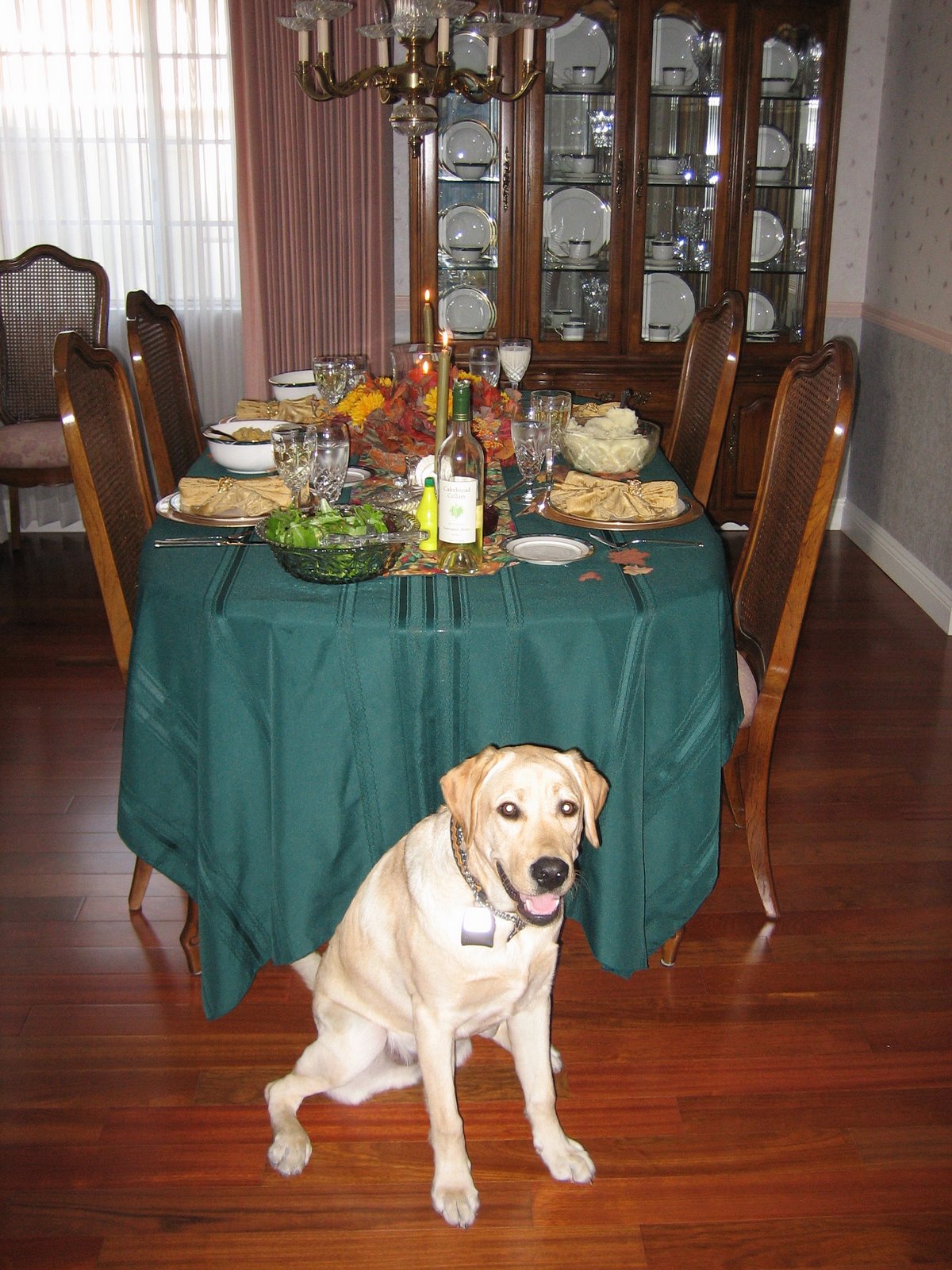 I played with him for a few minutes in the backyard so he could get some of his energy out before I asked him to lie down politely next to my chair during dinner. Aside from a few “grumpus noises” of complaint (he is less a whiner than a grumbler, vocally speaking), he was quite patient. Nevertheless, while I was on the phone with my parents, Truman decided he’d had quite enough of this self-control business and broke into a gloriously unfettered Labrador Shuffle, much to the delight of my aunt and cousin, who had never witnessed such a display (they have two very dignified cats, no dogs). The house is hardly puppy-proof, but Truman is surprisingly nimble and managed to turn his speedy circles on the carpet with only one head-smack into the coffee table. The hardwood floor proved amusing but not as shuffle-friendly, so he returned to the living room for the finale. I haven’t heard my aunt laugh that hard in a while….