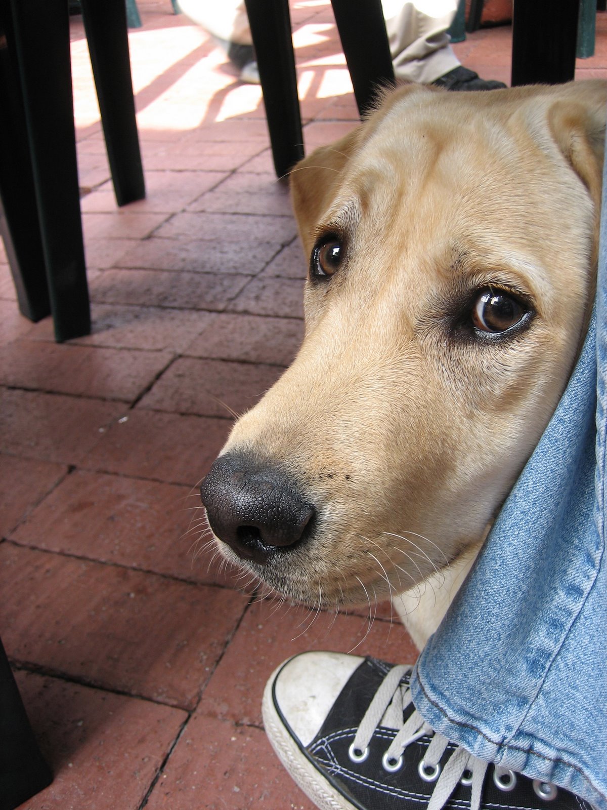 September 22, 2007 — Restaurants are always an adventure with Truman, because if I don’t do good enough under-the-table recon, there is potential for great mess making. It’s happened before: the apparently delicious puddle of syrup I didn’t see against the dark pattern of the carpet, the gum I completely missed until it was so embedded that I had to do hair surgery….