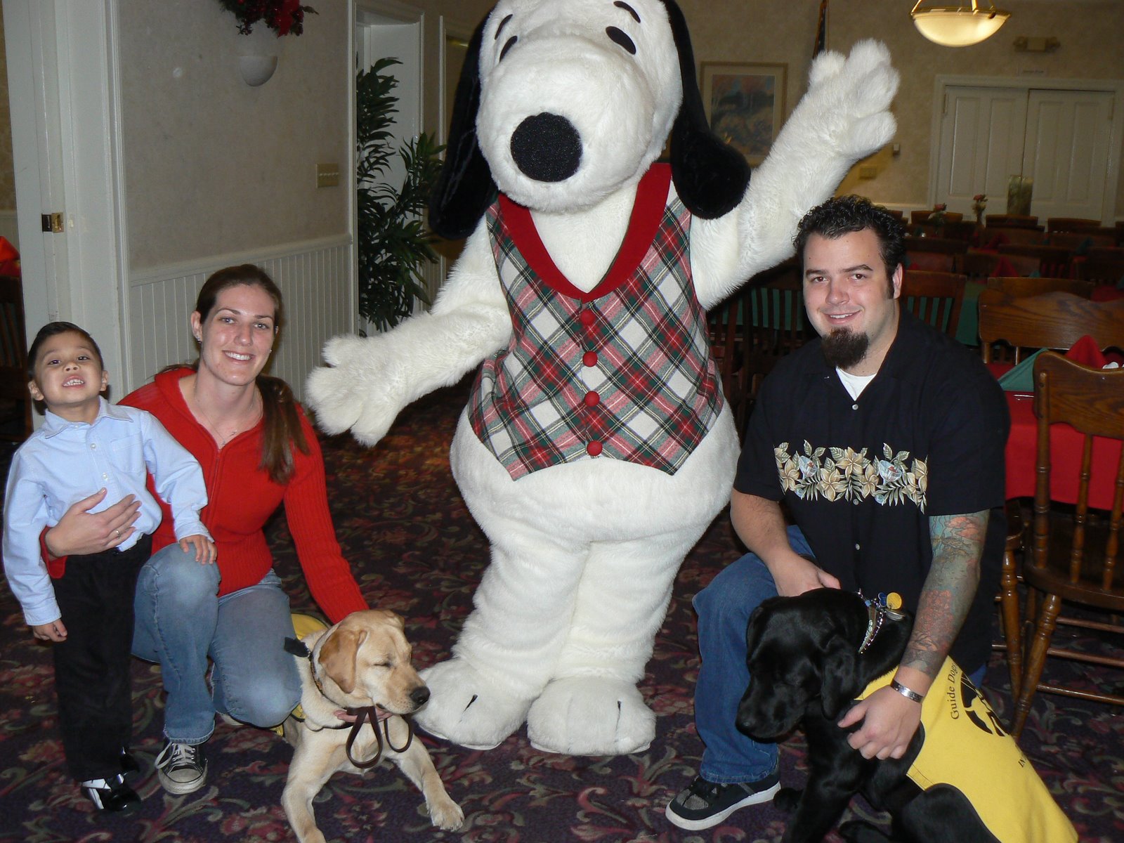 Fellow raiser Tracy and her brother Steven took him for a few days. Truman had a great time — he went to a couple of Christmas parties, the Cal State Long Beach campus, and a brunch at Knott’s Berry Farm, where he and Tai both met Snoopy.