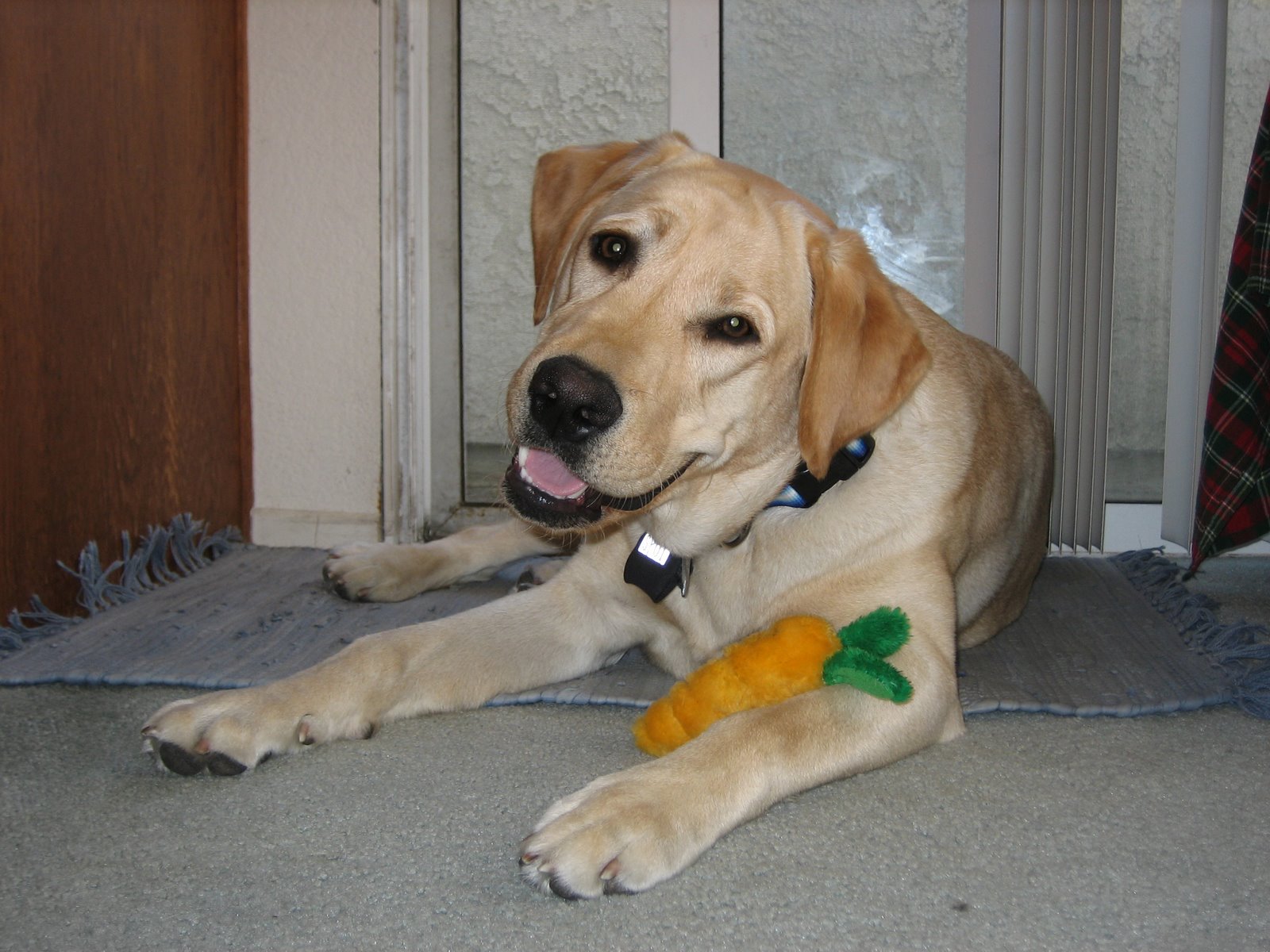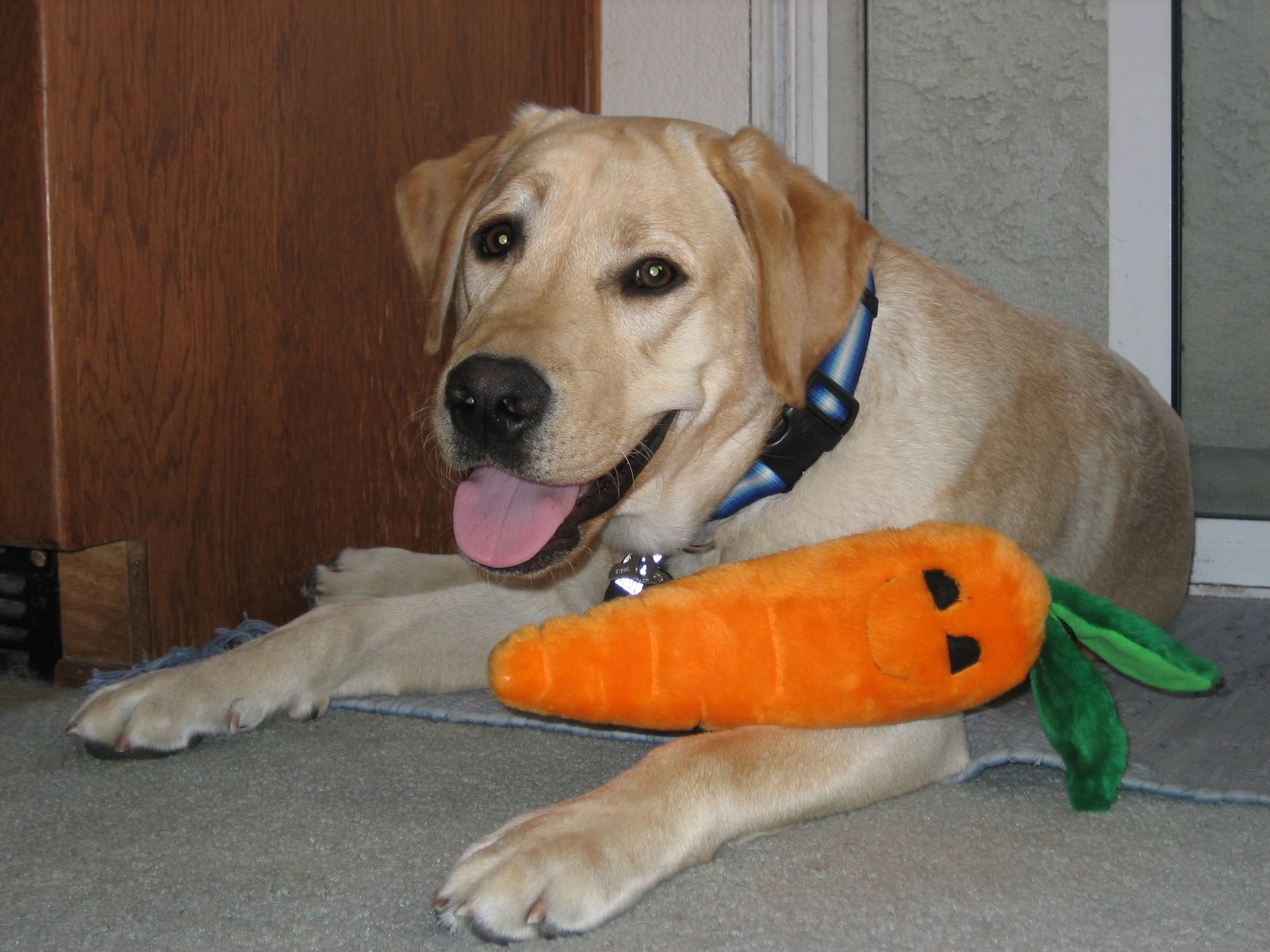 5. The carrot is terrific but look at that handsome new collar! Happy first Birthday, wags and licks,