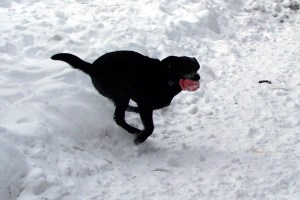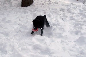 December 27, 2007 — Black dogs show up better in the snow. Here, Truman’s brother Tai demonstrates how the boys spent their time in Mammoth: