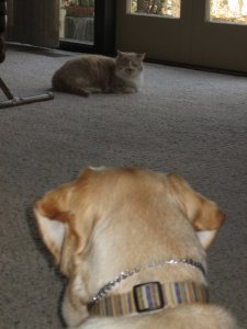 When they first met, she was not pleased about this young punk Labrador thundering into her territory with all the grace and subtlety of a drunken rhinoceros in red sequined tap shoes. The Roo was, of course, fearless as always, but Aged Feline in Residence Tigger planted herself at the top of the stairs and made her displeasure known by standing her ground, emitting some unearthly growls and I’m-not-kidding hisses, and doing her Jurassic best to position her old bones into a semi-threatening arch of cranky catness.