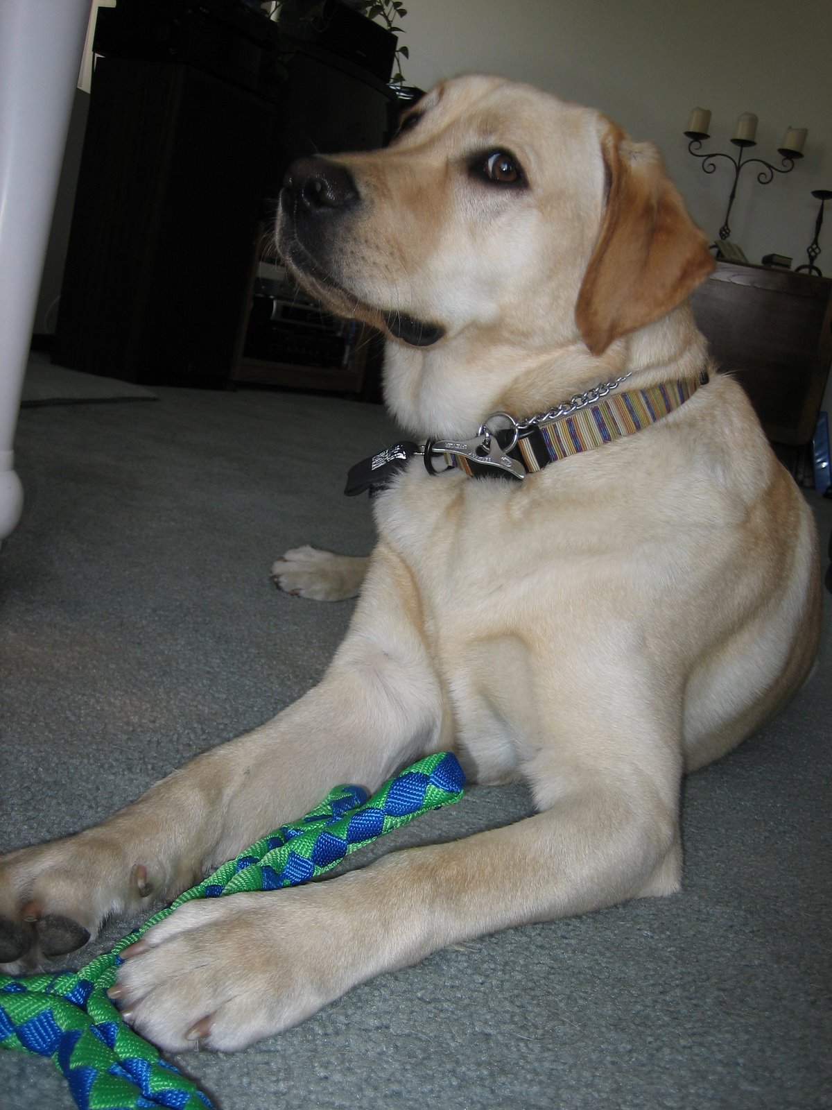 Very cute. He looks like he knows that you hid his favorite chewie.
